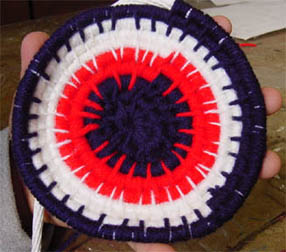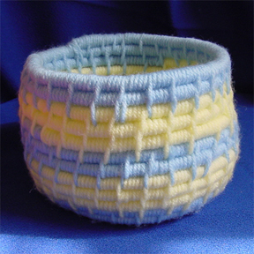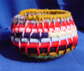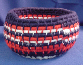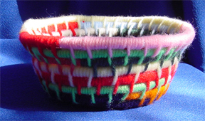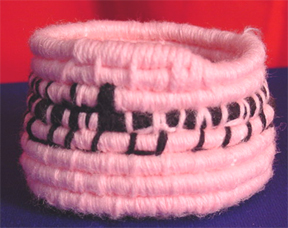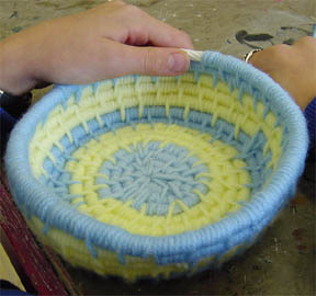 To add more yarn, leave a 1" "tail" from the previous thread and place the end of a new piece beside it against the cord. Wrap the new yarn around the ends and the cord, and then place a stitch to attach it to the previous round. To add more cord, simply trim the ends to taper and cover the splice with masking tape. As the cord is completely wrapped with yarn, the splices are not visible. End the basket by tapering the cord and wrapping and stitching. Students who finish early may want to make tops for their baskets!