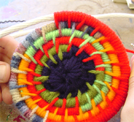 After they completed the first round, they wrapped the yarn around the cord 5 times and then put the needle under the previous round to hold it together. There are many variations on the wrapping pattern and binding stitch, but we found that "wrap 5 and stitch 1" worked pretty well!
