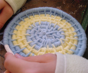 Students started their baskets using 12' of cotton clothesline (purchased from Wal-Mart), a yarn color of their choice (using a piece of yarn as long as they were tall), and a needle with a large eye. They wrapped yarn around the last inch of the clothesline (the cord), pulled it together to make a small loop and wrapped yarn to hold it together. After that, they wrapped the yarn 5 times around the cord, and then used the needle to go into the center of the loop.