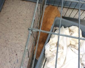 My co-worker fed them on Saturday morning. Because we didn’t feel comfortable opening the crates, we devised a way to use a long wooden spoon and a spouted watering can to reach through the bars of the crates to add food and water to their bowls.
