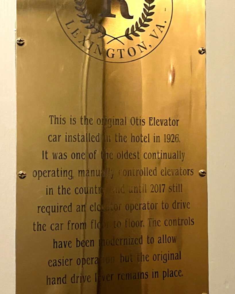 Over the years I’d been “to and through” Lexington, Virginia, but I’d never really explored the town, and I’d never stayed there. For this mini-vacation we stayed at The Gin Hotel, right on Main Street. Built in the 1920s, this historic hotel was restored and renovated by new owners in 2014. With present-day amenities–combined with its original Art Deco design elements–it was both a comfortable and an “artsy” experience!