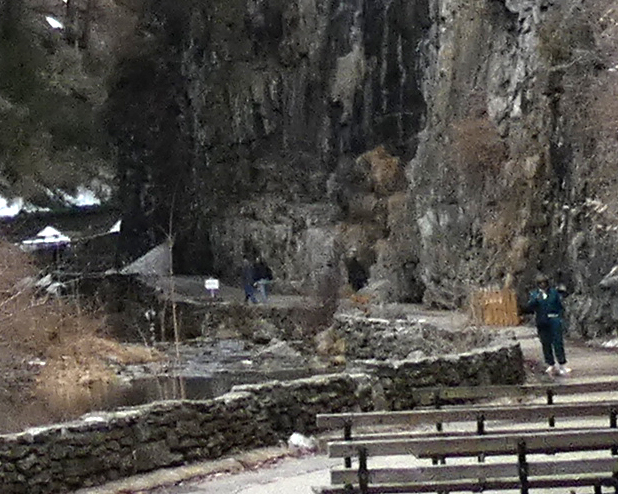This is the same picture as above, just zoomed in and cropped to show the size of the people in relation to the height of the bridge. So yes, Natural Bridge is massive, rising 215 feet above Cedar Creek, which flows through its opening.