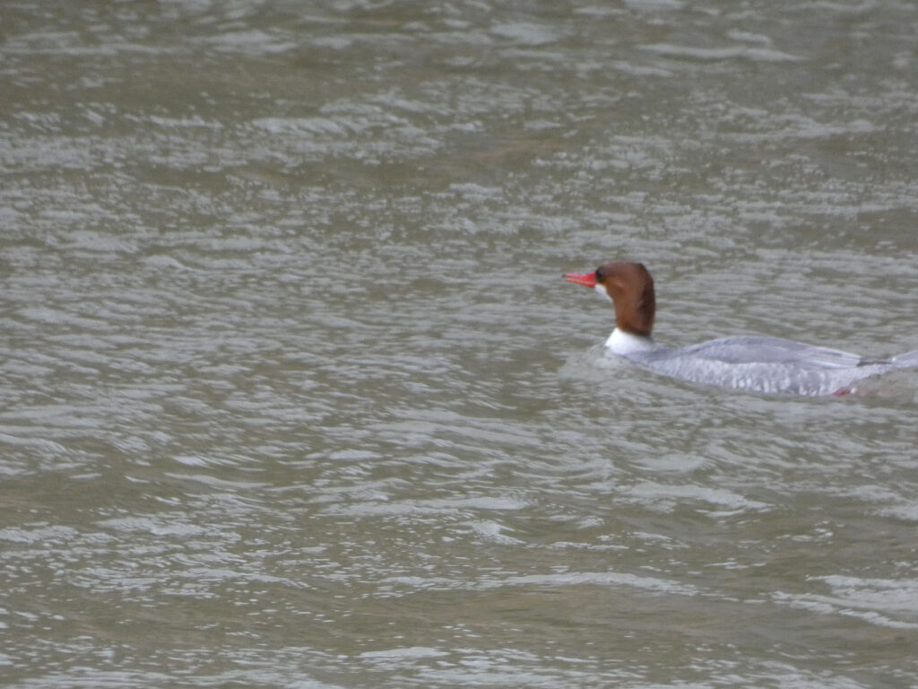 After lunch at Blue Ridge Deli in Natural Bridge Station, our next stop was in Glasgow, VA. A large duck, likely a female Common Merganser, was surfing the waves of the Maury as it flowed into the James River at the confluence.