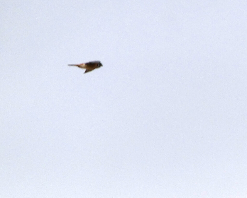 As we started driving away from the confluence, I spotted a bird hovering over the fields. While it was too far away to get a good picture, I’m almost positive that this was an American Kestrel, as I was able to get better photographs of one doing the same thing in October 2016! Kestrels, the smallest falcons in North America, are known for their “windhovering” ability which allows them to remain almost stationary while searching the ground below for prey.