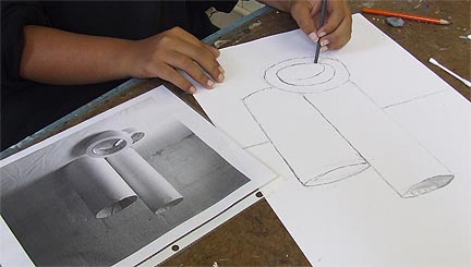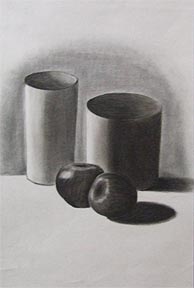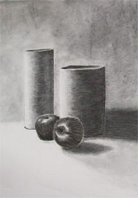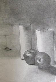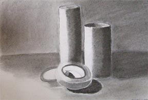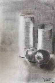 After experimenting with vine charcoal, compressed charcoal and charcoal pencils, Art 2 students began a series of "practice" drawings on white sulphite. A variety of black and white photographs of still life arrangements were available for them to use as reference.