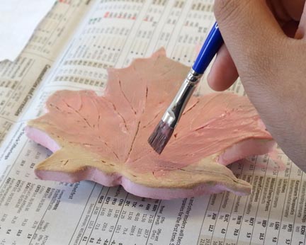 During the fall of 2017, students again had the opportunity to work with clay when we did the same project. We started by wedging low-fire white clay, and then used rolling pins to roll each slab to about 1/2" thick. Next, students selected a leaf, placed it right side up on top of their clay, and gently pushed down and rubbed to transfer the texture of the leaf onto the clay. They carefully traced the leaf, cutting all the way through the clay, and pulled away the excess.