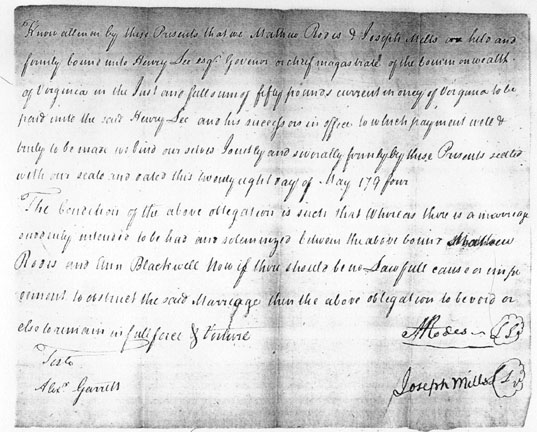 Know all men by these Presents that we Matthew Rodes & Joseph Mills are held and firmly bound unto Henry Lee esq. Governor or chief magastrate of the Commonwealth of Virginia in the Just and full sum of fifty pounds current mony of Virginia to be paid unto the said Henry Lee and his successors in office to which payment well & truly to be made we bind ourselves Soundly and severally (?) formally (?) by these Presents sealed with our seals and dated this twenty eight day of May 179 four.
