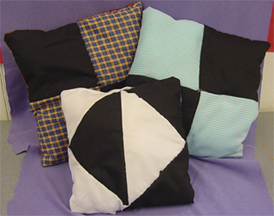 Once all the pieces were sewn together for the top, students chose a fabric to use for the back of the pillow. They again used a 1/4" seam and sewed the two pieces together (right sides facing), leaving a small opening at one edge to insert the stuffing.