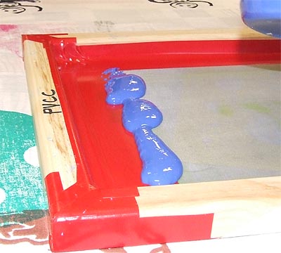 If everything looked okay after the test print, the frame was carefully centered on a T-shirt (in which a heavy piece of matboard had been placed to prevent bleed-through!), more ink was applied (if necessary) and a squeegee was used to pull the ink from the top to the bottom of the screen. The squeegee was turned around, and the ink was then "pushed" back to the top of the screen. Again the squeegee was turned, the ink was pulled towards the bottom and then pushed to the top. After this, a "dry pass" was made across the fabric.